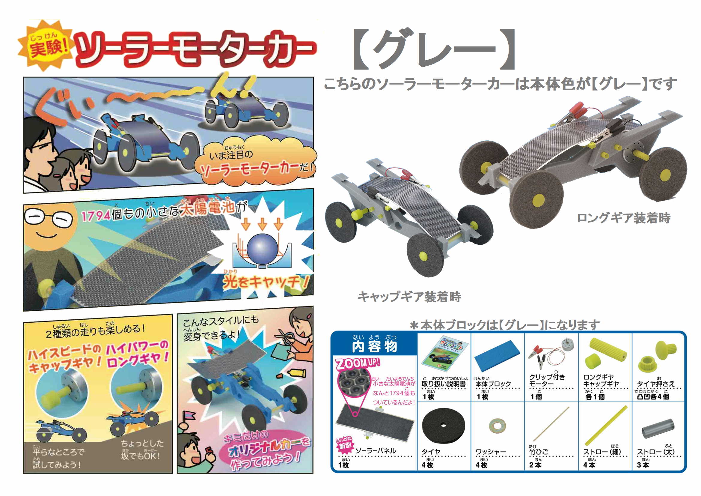 【内容物】ソーラーパネル ボディシート タイヤ タイヤ固定部品 ギア キャップギア クリップ付モーター ワッシャー ストロー(太・細) シャフト(竹ひご) 説明書