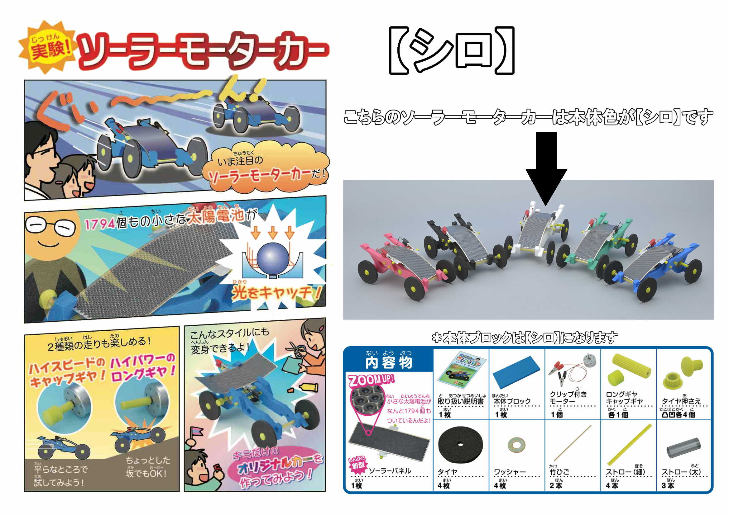 【内容物】ソーラーパネル ボディシート タイヤ タイヤ固定部品 ギア キャップギア クリップ付モーター ワッシャー ストロー(太・細) シャフト(竹ひご) 説明書